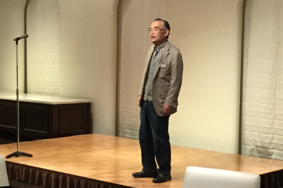 そして毎年シアトルから来られている千歳敦子さんに乾杯の発声を頂き、懇親会がスタートしました。 和食に舌鼓を打った後、演芸作家で今日まで52年間「笑点」の担当をされていた遠藤佳三さんに「テレビ・裏話」 を面白くお話し頂きました。 また東京商工会議所江東支部会長をされている小泉宗孝さんからは、2年後に開催される「東京オリンピック・パラリンピック」 の競技場が、江東区内に10か所出来る事や交通事情などホットな話題でお話を頂きました。2年後が楽しみです。 話の続いたあと、田林晃さんが「オー・ソレ・ミオ」をアカペラで歌われ、素晴らしいテノールの歌声に一同感動しました。 そして暫くは方々でお喋りや笑い声の続く和やかなうちに、斎藤勉さんの指揮で校歌を斉唱、また来年10月3日(木)正午に アンフェリシオンでの再会を誓って三々五々家路に就きました。