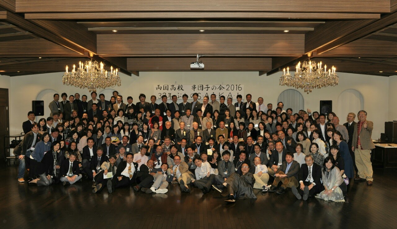 『32年ぶりの再会から再開しよう』そんなスローガンを掲げて両国高校第81期生(通称「串団子の会」) の卒業後32年ぶりの同窓会を2016年11月19日亀戸のアンフェリシオンで開催いたしました。 当時の各クラス担任の先生5人(関根先生、田中先生、岡野先生、澤村先生、中島先生)のご参加を含め、175人が集まる盛大な同窓会 となりました。 ある同窓生の早すぎる死がきっかけですが、ほとんどの同窓生と繋がりがない中、ラインという便利なツールをうまく活用して、 できる限り繋がろうと活動を始めたのが2016年3月のことです。 5月には100人が繋がり、そこから3年時のクラス(A〜I)単位で実行委員を決め、淡交会名簿から各クラスで郵便作戦を行うなど、 楽しくワイワイと32年ぶりの同窓会を企画することができました。 同窓会当日は、その懐かしさからか、受付時から大変賑やかな雰囲気となり、会においては関根先生の声高らかな乾杯で始まり、 司会からは改めてお世話になった先生方を、32年前のエピソードを披露しながらご紹介、そして先生方からは当時のままの変わらぬ口調で、 数々の名台詞をご披露いただきました。 笑顔の絶えない楽しい会が続き、後半はこの同窓会を開くきっかけとなった同窓生への感謝状の授与、そして175名で昔懐かしい校歌の斉唱、 最後は、記念撮影を行い大盛況に幕を閉じることができました。 32年ぶりの容姿の変化はあれど、気心知れた仲間同士の笑顔は、昔と変わらずにうれしいものでした。 次回の同窓会開催の予定はありませんが、5年後あるいは10年後には200人を超える同窓会が開催されることを楽しみにしています。